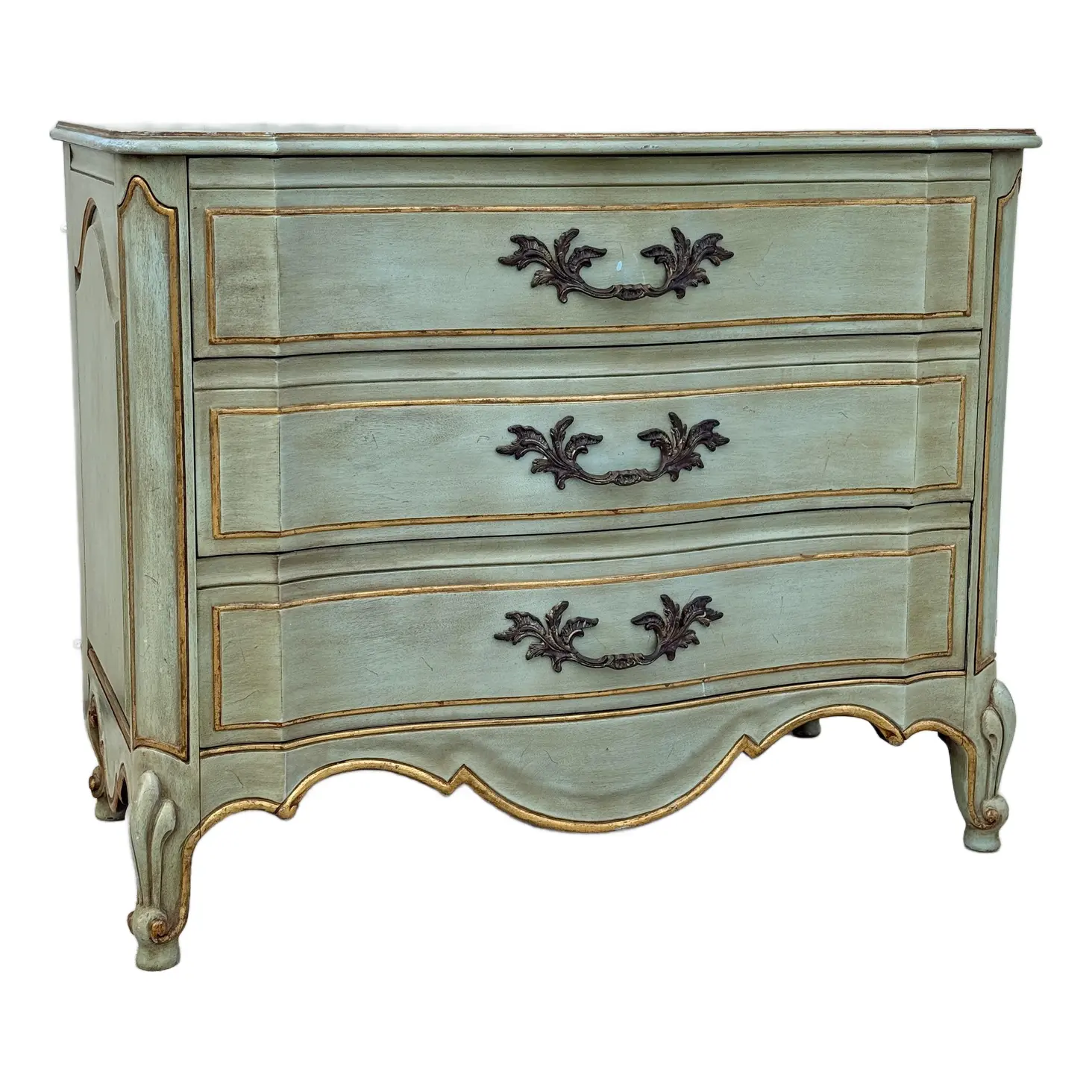 A beautifully crafted Mid-20th Century French Provincial Bombay chest by Karges, featuring a gracefully curved silhouette and an elegant hand-painted finish in a soft antiqued green with gold trim.