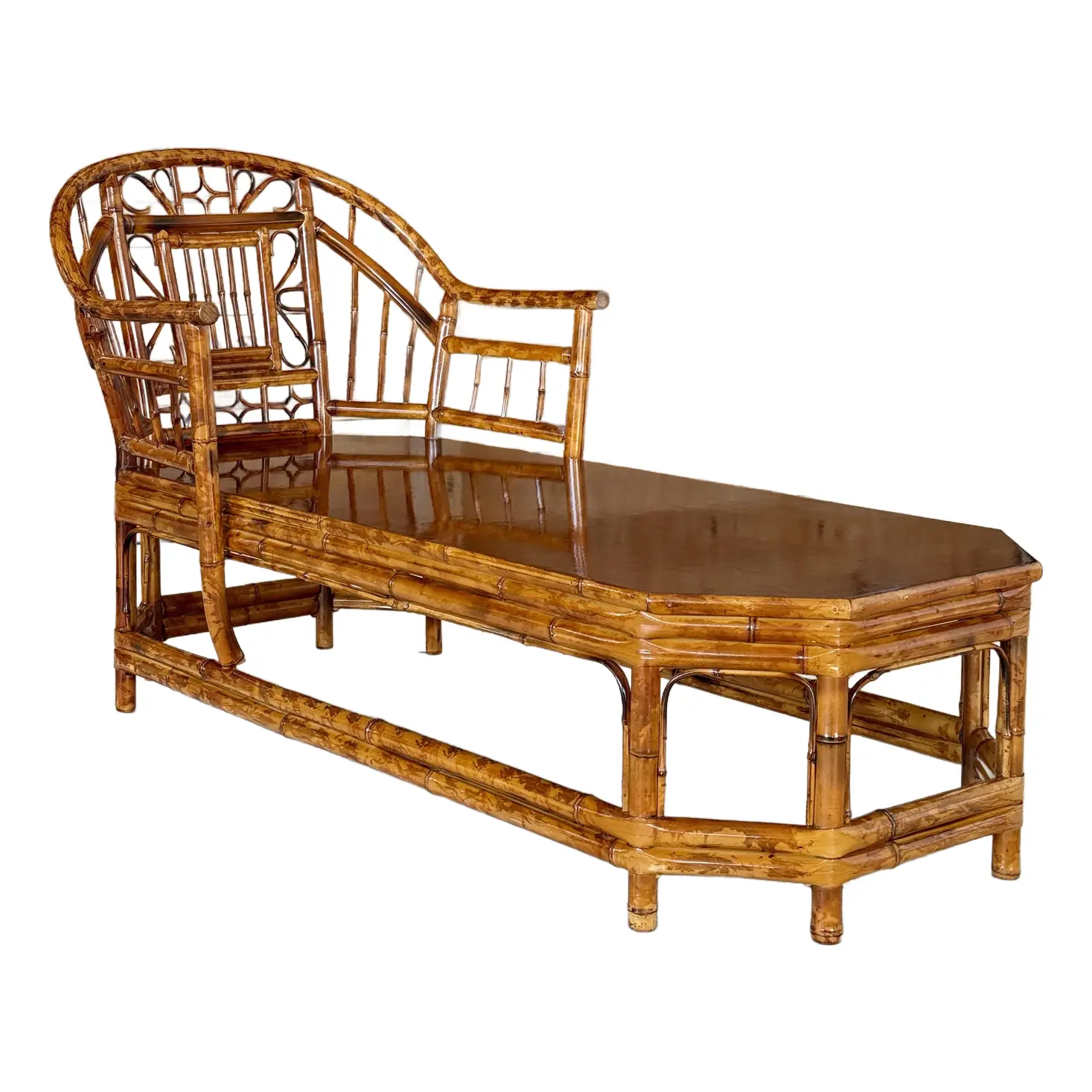 A sculptural and stylish vintage bamboo chaise lounge inspired by the iconic Brighton Pavilion aesthetic, showcasing sweeping curves, intricate fretwork, and a rich burnt bamboo finish.