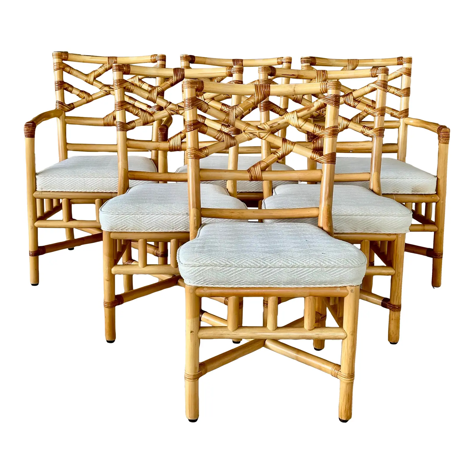 These elegant vintage dining chairs showcase a sophisticated Chippendale style back, expertly crafted from sturdy rattan by Clark Casual Furniture Inc.